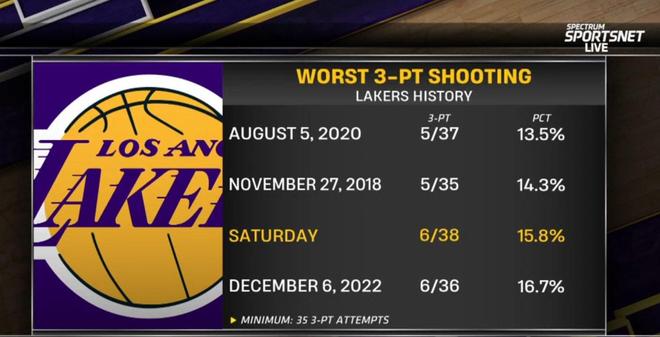集体手冷,湖人三分38中6仅15.8%命中率,队史第三差