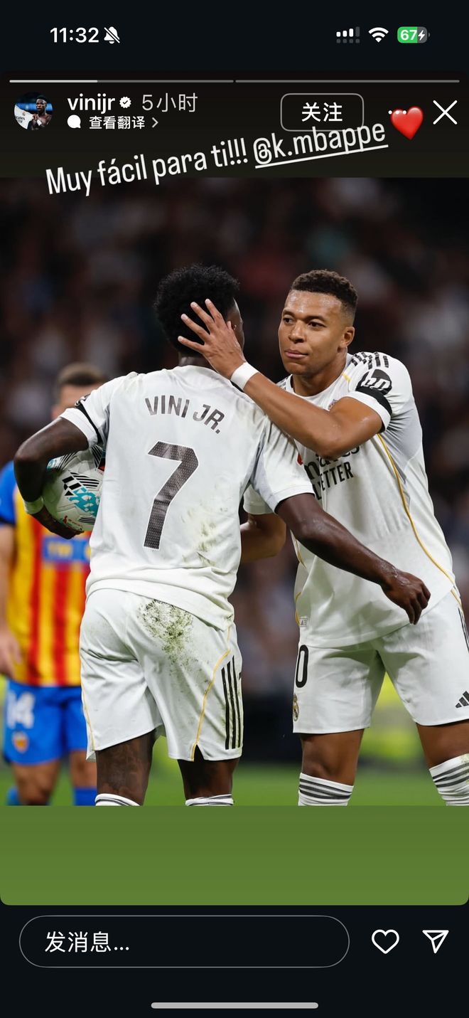 本场比赛皇马获得两次点球机会,第一球姆巴佩主罚命中,第二球维尼修斯主罚被扑出。赛后维尼修斯晒出与姆巴佩拥抱的合照,配文:“对你来说很容易@姆巴佩”,并配上爱心的Emoji。